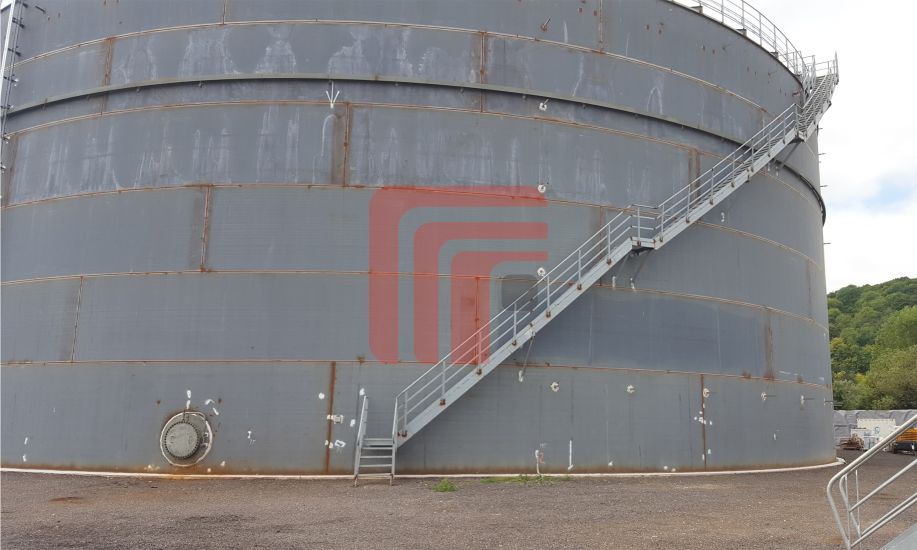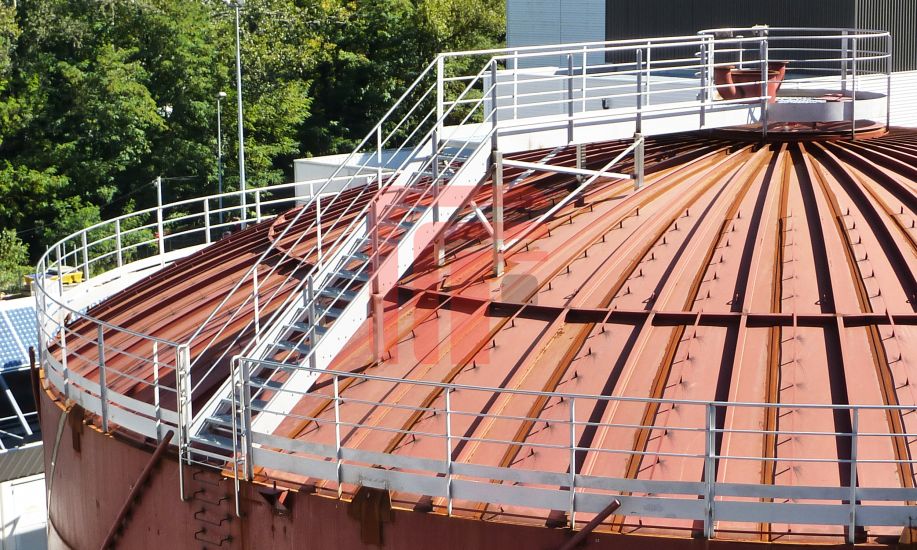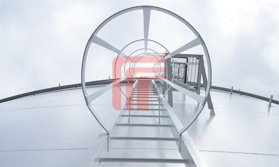 Construção de Escadas Helicoidais / Caracol para acesso a coberturas de Reservatórios Metálicos. São fixos à parede externa dos reservatórios, com plataformas de descanso providas de guarda corpos e rodapés protetores. Estas escadas são caracterizadas pela sua resistência química e leveza, sendo ideais para instalação em estruturas elevadas. As escadas helicoidais são ideais para paredes curvas, sendo construidas um degrau de cada vez, uma só peça e são encaixados entre si numa coluna central.