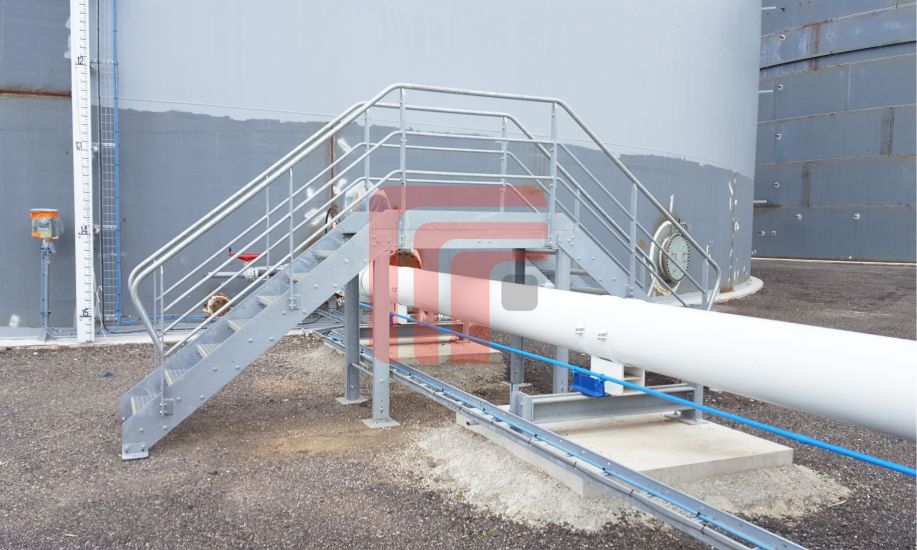 Construção de Escadas Helicoidais / Caracol para acesso a coberturas de Reservatórios Metálicos. São fixos à parede externa dos reservatórios, com plataformas de descanso providas de guarda corpos e rodapés protetores. Estas escadas são caracterizadas pela sua resistência química e leveza, sendo ideais para instalação em estruturas elevadas. As escadas helicoidais são ideais para paredes curvas, sendo construidas um degrau de cada vez, uma só peça e são encaixados entre si numa coluna central.